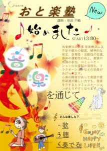 音楽を通じて楽しくもあり、音楽療法的な効果もあり、様々な効果を期待しいざ開講いたします♪